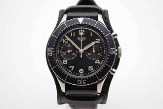 Bundeswehr Chronograph Flyback 1550SG, 43 mm case with black tritium dial, faded bezel and black leather strap with Bundeswehr no.This stunning 70`s military Chronograph comes with new main service and our brown vintage cube. Trades are always welcome. Please keep in mind that our complete inventory is stored in our bank safe for safety purposes.