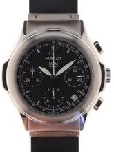 Band / Schließe: schwarzes Original-Kautschukband Ref. 139 10 56 mit Edelstahl signierter hublot Faltschließe, passend für ein 190 mm Handgelenk