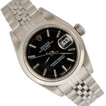 Rolex Date Ladies 26MM Stahl, Baujahr 1997, glatte Stahllünette, Saphirglas, schwarzes Farbzifferblatt mit Datum mit Indexen und Zeigern auf Tritium, automatisches mechanisches Uhrwerk, Stahl-Jubilee-Armband mit Rolex Faltschließe.