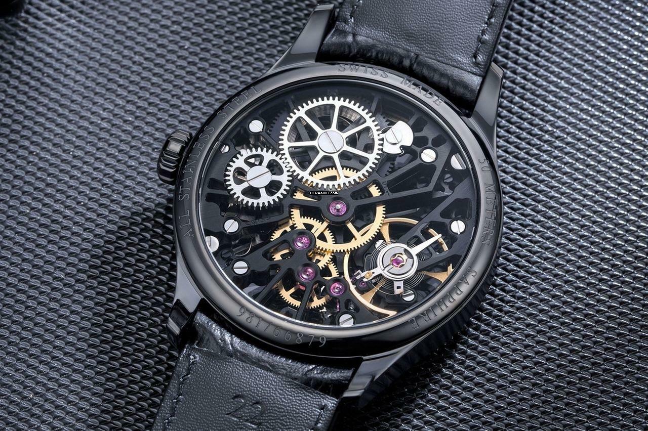 Gehäuse Stahlgehäuse, schwarz pvd beschichtet, gewölbtes Saphirglas, transparenter Gehäuseboden