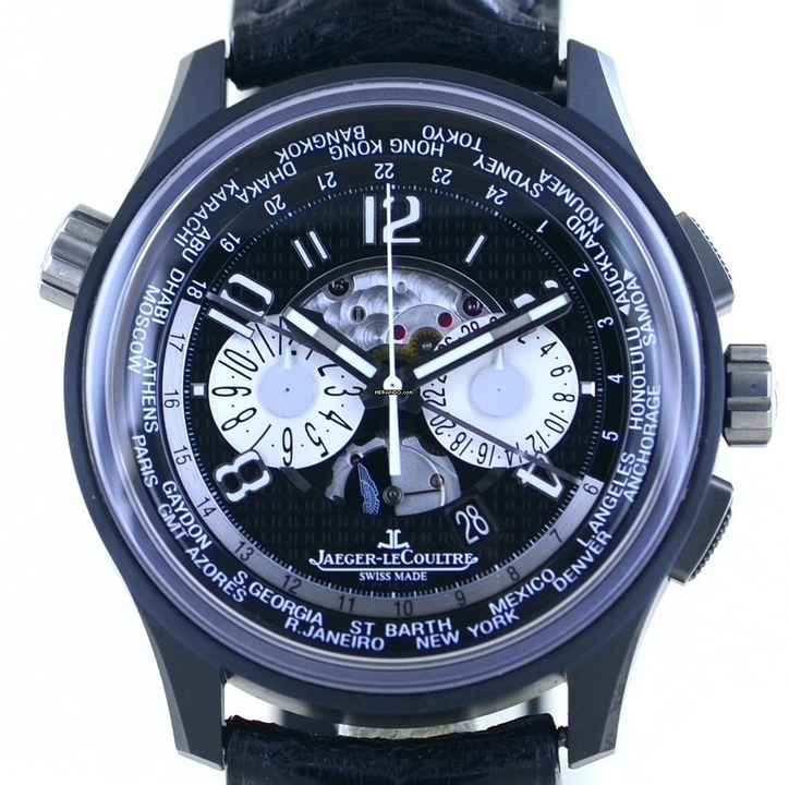 Der JLC Chronograph kommt mit einigen Higlights. Das extrem aufwändig gearbeitete Zifferblatt ist bis ins letzte Detail perfekt. Bedient wird die Uhr über die griffigen Drücker an der rechten Flanke. Die Weltzeiten werden über die Krone auf 10 Uhr bedient.