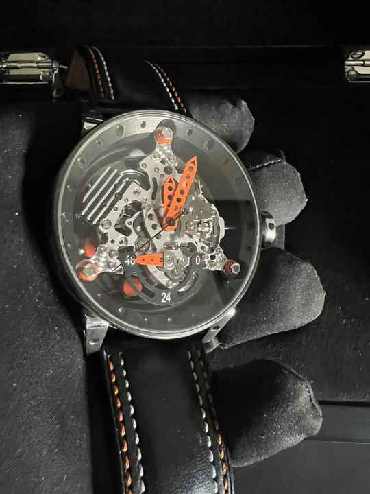 Skelettiertes Zifferblatt,Das Werk ist handgefertigt und wurde einem Sportwagenmotor nachempfunden. Dies ist reinster Maschinenbau im Miniaturformat. Allerfeinste Detailverarbeitung zeichnen diese Sportfahreruhr aus.