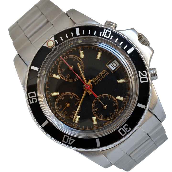 Bulova Chronograph Automatik Stahl, Baujahr ca. 1990, Mineralglas, einseitig drehbare Stahllünette mit schwarzem Aluminiumeinsatz zur Skaleneinteilung, schwarzes Zifferblatt mit Datum zu drei vertikalen Zählern, Indexe und Zeiger golden, Stahlarmband mit Faltschließe original Bulova.