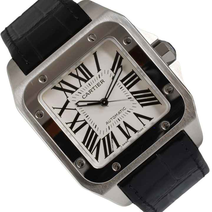 Cartier Santos 100 XL große Stahlversion, Herstellungsjahr 2020, Stahlglatte Lünette mit 8 Schrauben, Saphirglas anti-reflektierend, weißes Zifferblatt mit römischen Indexen und LumiNova-Zeigern, Automatikaufzug, schwarzes Alligatorarmband mit doppelter Stahlfaltschließe, original Cartier.