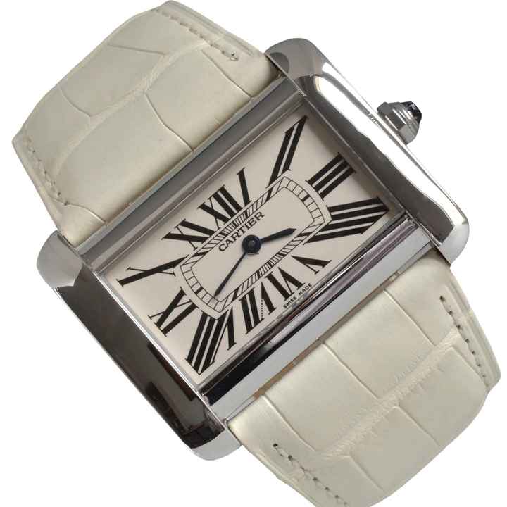 Cartier Tank Divan steel, year of production 2005, sapphire glass anti-reflective, cream colour dial with roman indexes and hands blue colour, quartz battery movement, alligator cream colour watch strap with steel buckle original Cartier.