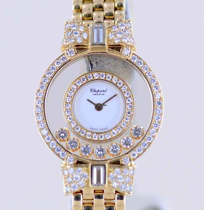Sehr schöne luxuriöse Chopard Happy Diamonds in Gelbgold mit einem schönen fünfreihigem Goldband. Über sieben fliegende Diamanten mit 0,39 Karat freut sich die Trägerin dieser Uhr. Sie befinden sich im Zwischenraum der beiden Saphirgläsern um das Zifferblatt und "fliegen" umher. Das Gehäuse dieser Chopard ist aufwändig mit 107 Brillanten von ca. 0.6 Karat besetzt. Besonders Higlight sind die beiden Baguette-Steine mit 0,25 Karat. Wunderbar luxuriöses und elegantes Design.