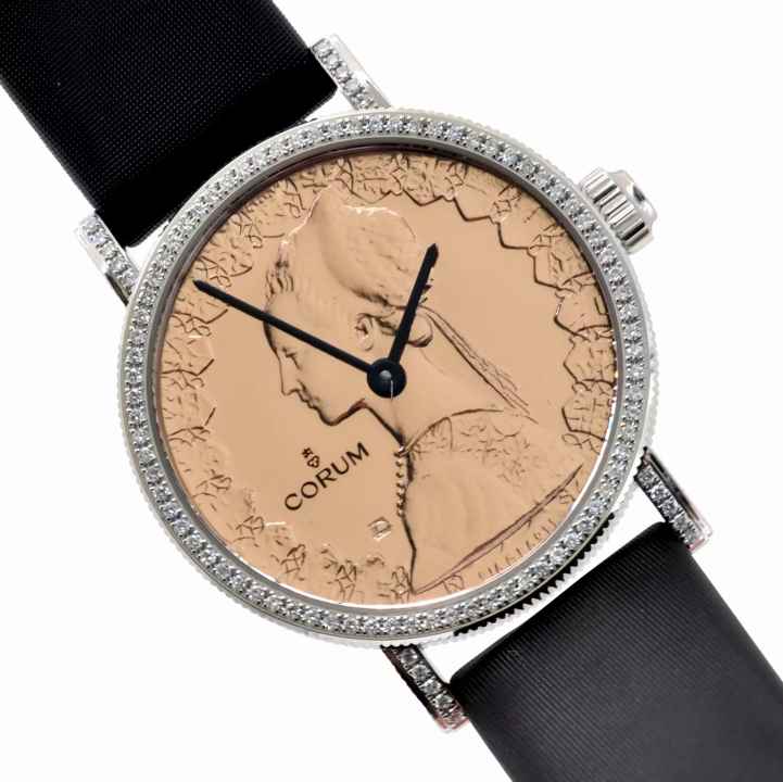 Corum Artisans Coin limitierte Auflage der 500 italienischen Lire in Stahl, Produktionsjahr 2019, Stahllünette mit 0,50 kt echten Diamanten, Saphirglas entspiegelt, Roségold 18KT unzirkuliert Zifferblatt mit Darstellung der 500 italienischen Lire mit Frauenbüste und den drei Karavellen von Christoph Kolumbus, Quarz-Batterie-Uhrwerk, schwarzes Satinarmband mit Stahlschließe original Corum, sowie zwei weitere beige und rote Kalbslederarmbänder mit Stahlschließe original Corum.