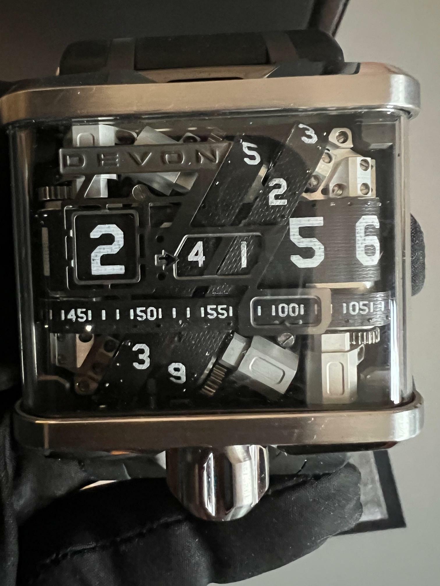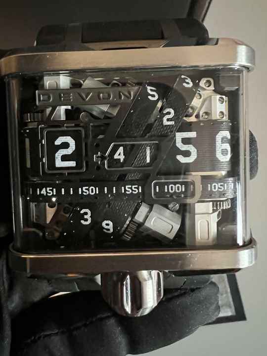 Das auffälligste Merkmal ist das von DEVON patentierte vollmechanische Zifferblatt. Ein System welches aus glasfaserverstärkten Nylonbändern, durch Umlaufen die Zeit anzeigen. Das Zifferblattglas besteht aus Polycarbonat. Der Antrieb der Devon Tread 1 ist ein sehr leistungsstarkes Lithium-Polymer Akku.