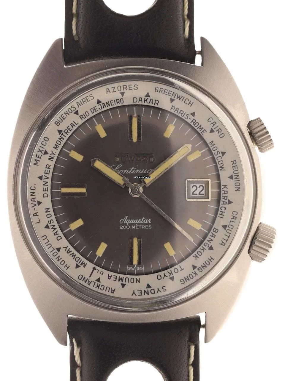 Gehäuse / Ref.: verschraubtes Edelstahl Antimagnetic Super Compressor 20 atm Gehäuse Ref. 1340, eine originale Aquastar Krone, innenliegende bidirektionale drehbare Lünette mit Weltzeitanzeige, Gravur im Innenboden 2472 ( bezieht sich auf das Kaliber ), Brevet 417.537 Brevet 337.462