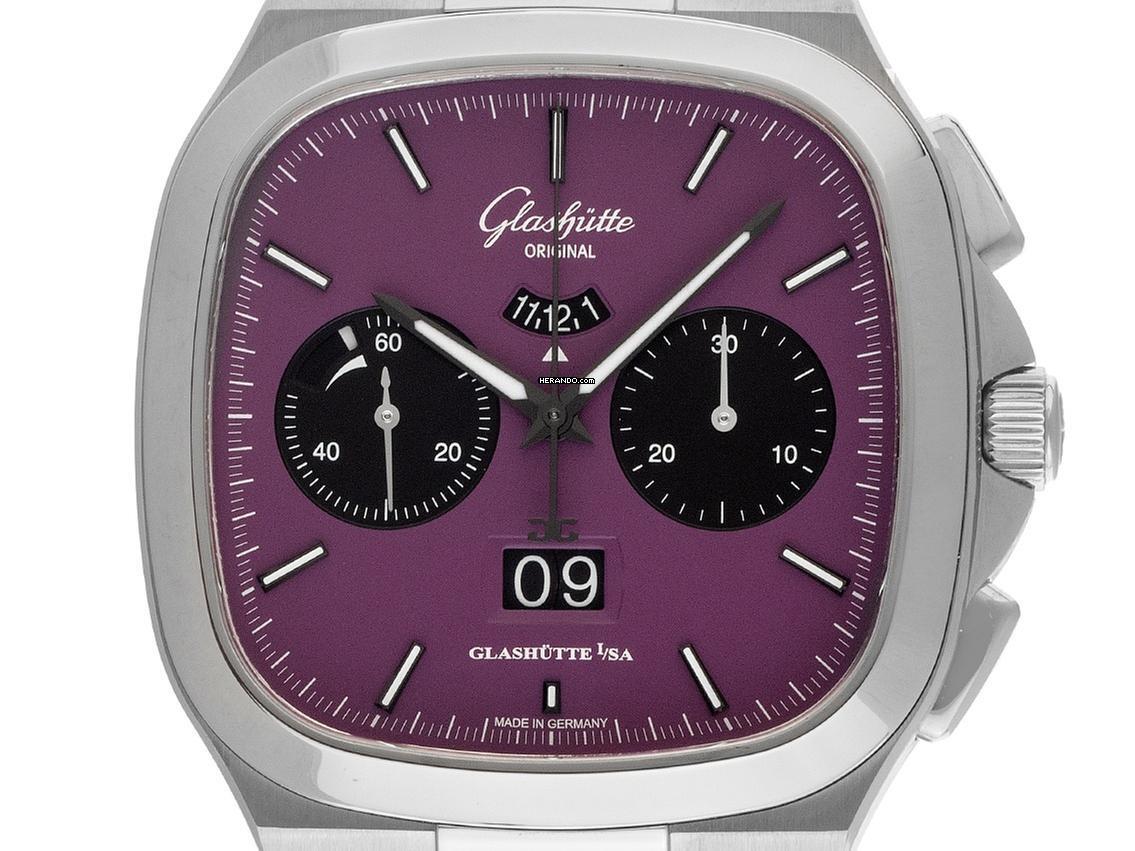 Glashütte Original Seventies Panoramadatum Stahl Automatik Chronograph Armband Stahl Gehäuse Edelstahl poliert und satiniert, rechteckig, Gehäusemaße ohne Krone (L x B x H) 40 x 40 x 14,1mm. Lünette Edelstahl glatt und poliert. Armband Edelstahl poliert und satiniert, Sicherheitsfaltschließe Edelstahl mit Hersteller-Logo. Zifferblatt violett "Plasma" matt lackiert mit aufgesetzten schwarzen Leuchtindexen und schwarzen Leuchtzeigern. Uhrwerk Automatik, Glashütte Original Manufakturkaliber 37-02 mit 65 Edelsteinen, Gangreserve ca. 70 Stunden, 28.800 A/h. Glashütte Dreiviertelplatine mit Streifenschliff, Schwanenhals-Feinregulierung, Rotor skelettiert mit Streifenschliff und Doppel-G-Logo. Anzeige von Stunde und Minute über Zeiger aus der Mitte, kleine Sekunde mit Sekundenstopp zur sekundengenauen Einstellung der Uhrzeit bei 9 Uhr, Panoramadatumsanzeige mit Schnellverstellung bei 6 Uhr, einstellbar über Drücker bei 10 Uhr, Gangreserveanzeige zwischen 9 und 10 Uhr. Saphirglas kratzfest. Krone verschraubbar mit Flankenschutz und Hersteller-Logo. Boden Edelstahl 8-fach verschraubt und graviert mit Saphirglas Sichtfenster. Gewicht der Uhr inklusive Armband 188g, Länge des Armbandes inklusive Gehäuse 185mm. Wasserdicht bis 10 ATM. Referenznummer: 1-37-02-20-02-70, ID: ST1160231280426H-16800, Artikelnummer: 10000085400. Original Glashütte Original Box mit Umkarton und Garantie Papiere von März 2026, Full Set. Limitiert auf 100 Exemplare. Ungetragen. Lieferzeit sofort. Inklusive Uhrenpass mit einem Farbbild, der genauen Beschreibung sowie dem Wiederbeschaffungswert der Uhr über 16800,-€ und 1000 Tage Garantie ab Kaufdatum.