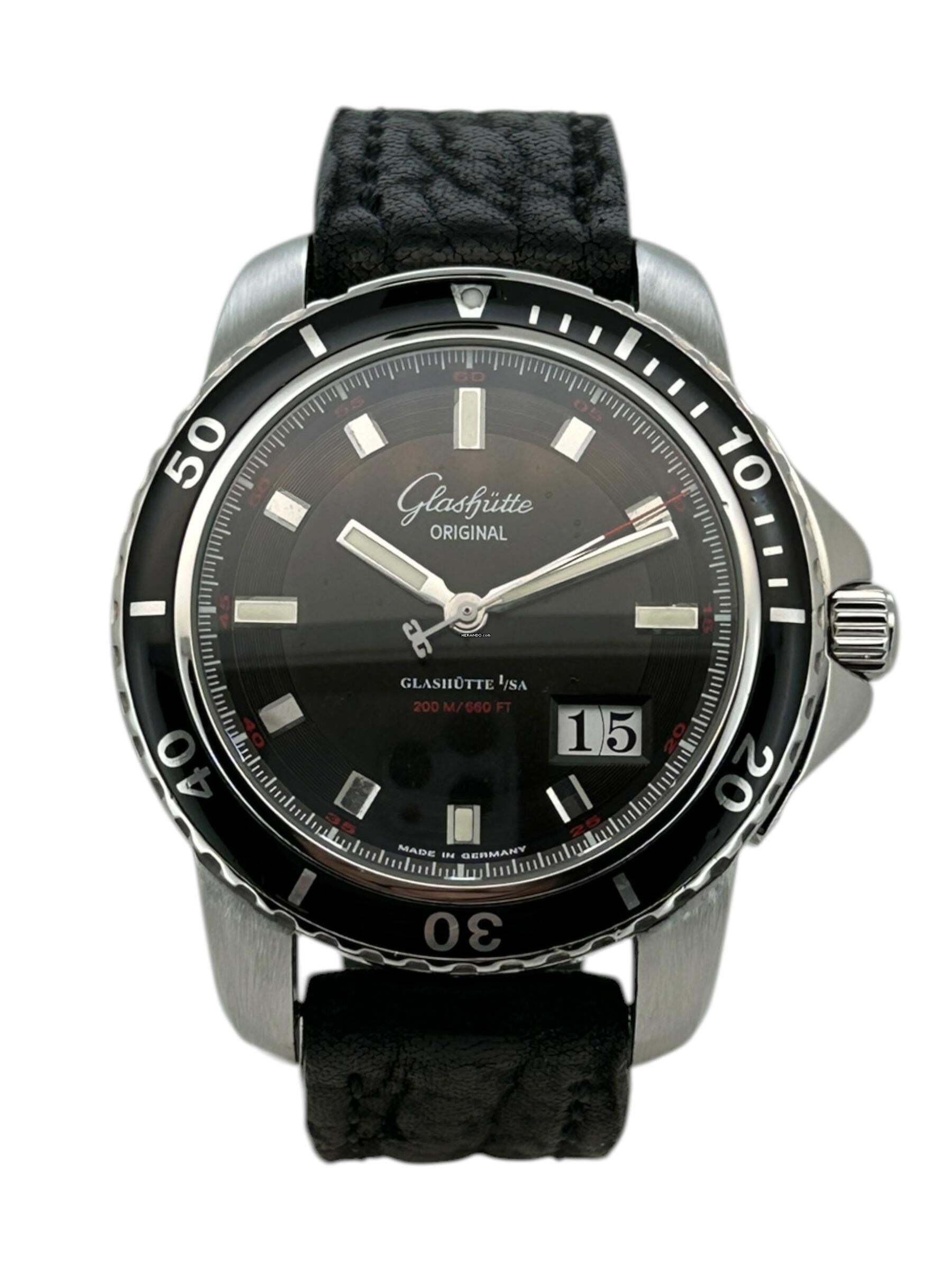 Die Glashütte Original Sport Evolution ist eine markante Taucheruhr, die deutsche Uhrmacherkunst mit sportlicher Funktionalität verbindet. Das schwarze Zifferblatt mit klaren Leuchtindizes und Zeigern sorgt für optimale Ablesbarkeit, während die charakteristische Panorama-Datumsanzeige bei 4 Uhr den praktischen Nutzen unterstreicht. Die einseitig drehbare Lünette mit markanter Minutenskala verleiht der Uhr ihren sportlichen Charakter.