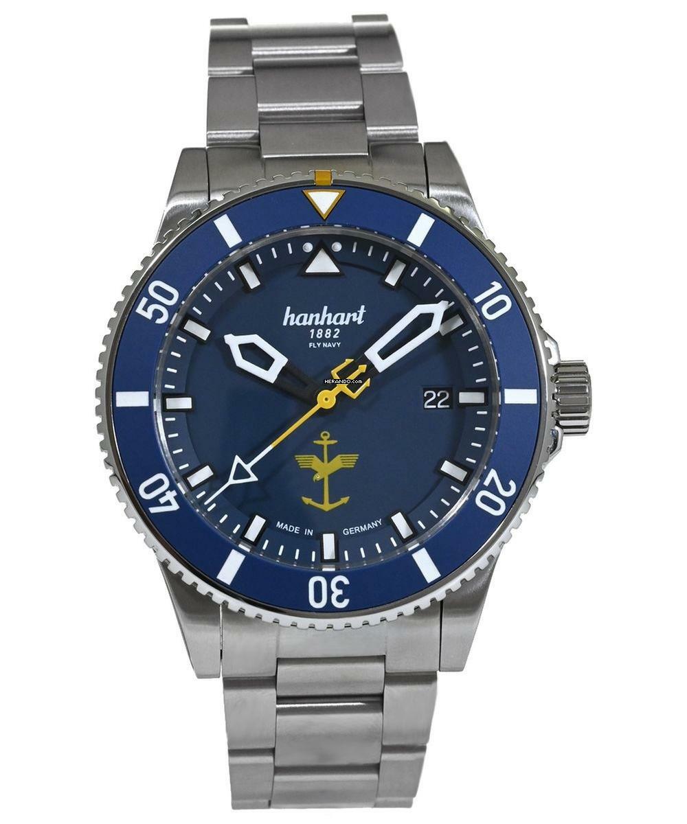 Ref. 773.274-3338 (7732743338), Herrenuhr, Edelstahl, Drehlünette aus Keramik, Durchmesser 42 mm, Höhe ca. 13 mm, wasserdicht bis 30 atm, Saphirglas, verschraubter Boden und Krone, Automatik Sellita SW200, Gangreserve ca. 38 Stunden, Stunden, Minuten, Sekunden, Datum, blaues Zifferblatt mit Leuchtzeiger und Leuchtmarkierungen, Edelstahlarmband mit Faltschließe, + zusätzliches blaues Textilband mit Hook Strap Verschluss. Original Box und Papiere 09.2024.Die Hanhart Fly Navi Aerosphere Sonderedition mit der Referenz 773.274-3338ist eine limitierte Uhr, die von der deutschen Uhrenmarke Hanhart hergestellt wird. Hanhart ist bekannt für seine hochwertigen Fliegeruhren und Chronographen, die oft eine Verbindung zur Luftfahrt haben.Die Fly Navi Aerosphere Sonderedition ist auf nur 150 Exemplare limitiert, was sie zu einem begehrten Sammlerstück macht.Das Gehäuse besteht aus Edelstahl mit einer Drehlünette aus Keramik und hat einen Durchmesser von etwa 42 mm. Es zeichnet sich durch ein robustes Design aus, das sowohl für den Einsatz in der Luftfahrt als auch im Alltag geeignet ist.Das Zifferblatt ist in einem Naviblau gehalten und bietet eine klare Ablesbarkeit mit großen, leuchtenden Indizes und Zeigern. Die Gestaltung des Zifferblatts spiegelt den funktionalen Charakter einer Fliegeruhr wider.Angetrieben wird die Uhr von einem Automatikwerk mit einer Gangreserve von bis zu 38 Stunden. Hanhart-Uhren sind bekannt für ihre Zuverlässigkeit und Präzision.Die Fly Navi Aerosphere wird mit einem blauen Textilband geliefert, um den sportlichen Charakter der Uhr zu unterstreichen.Diese Uhr ist bis zu 300 Meter wasserdicht, was sie für verschiedene Aktivitäten geeignet macht.