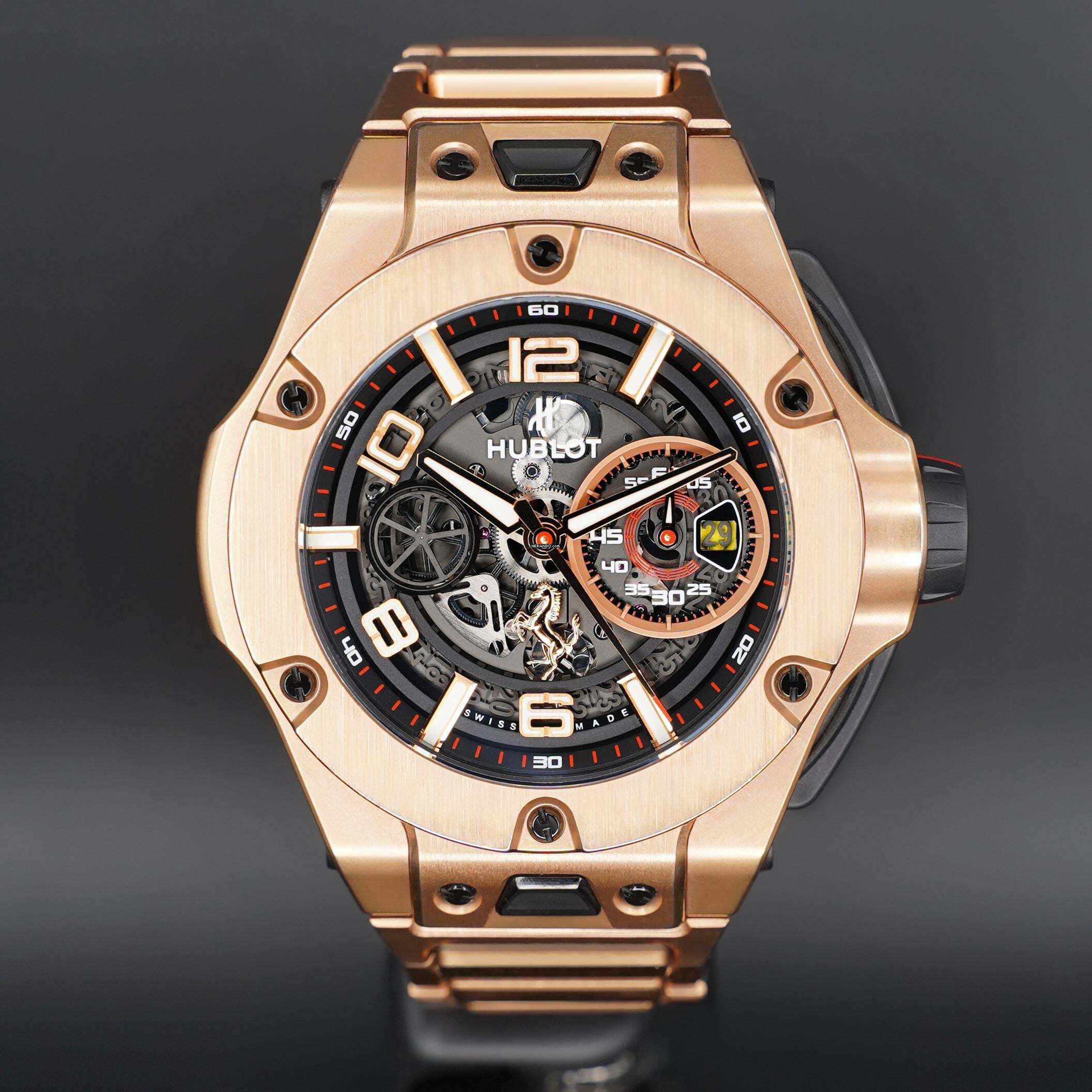 hiermit präsentieren wir Ihnen eine "HUBLOT BIG BANG FERRARI UNICO FULL ROSEGOLD" aus dem Jahr 2018. Ein limitiertes Modell, im absolutem Fullset mit der begehrten Uhrenbeweger-Box von Hublot. Von dieser Uhr wurden weltweit 500 Stück gefertigt. Die Uhr selbst stammt aus Sammlerhänden. Dies spiegelt sich dementsprechend im Zustand wieder.