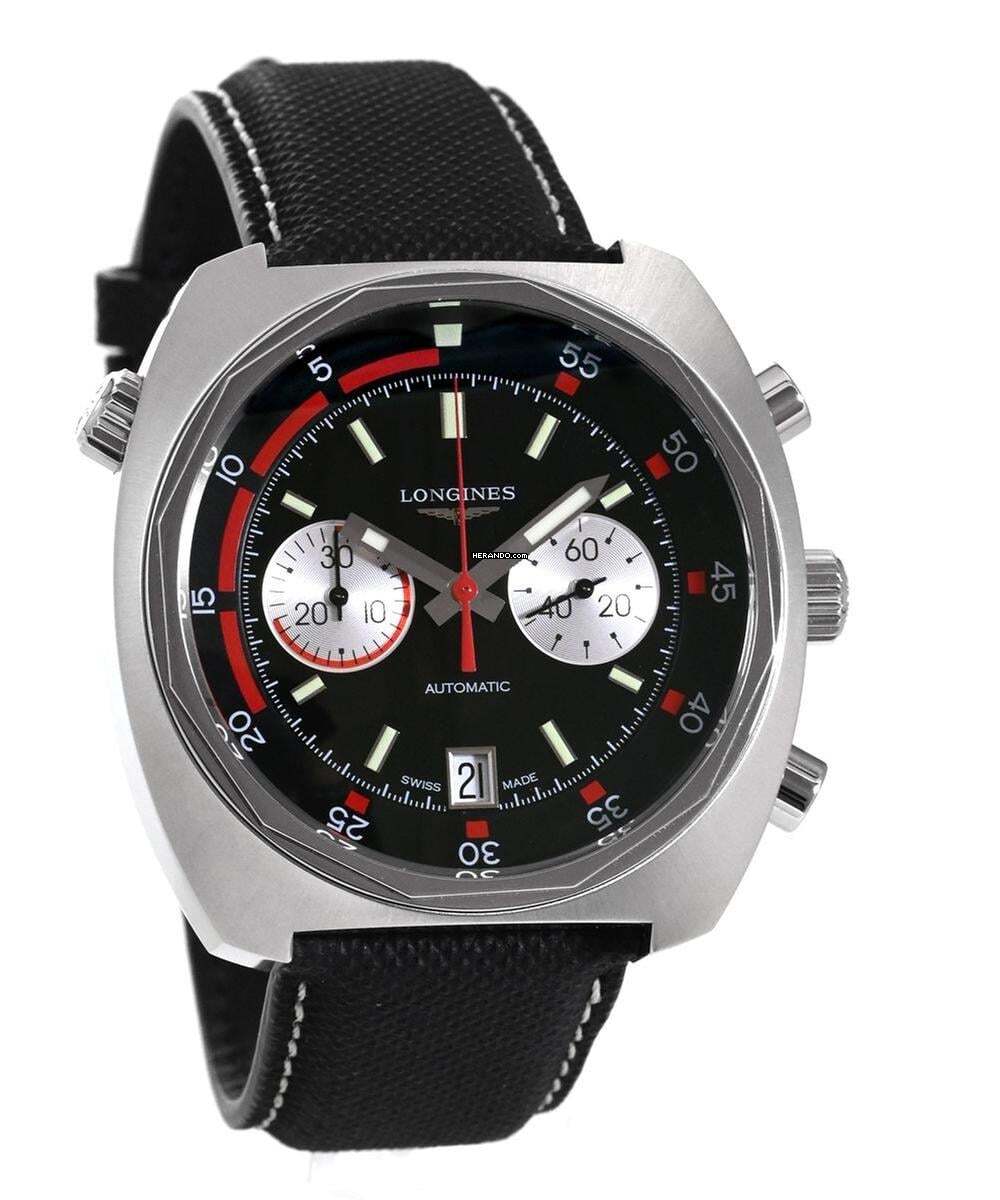 Ref. L2.796.4.52.0, (Ref. L27964520), Herrenuhr, Edelstahl, Durchmesser 43 mm, Höhe ca. 15,5 mm, wasserdicht bis 30 atm, drehbarer Innenring, Automatik, Stunden, Minuten, kleine Sekunde, Datum, Chronograph, Schwarzes mit Leuchtzeiger und Leuchtmarkierungen, schwarzes Textilband mit Dornschließe. Originale Box und Papiere 02.2016. Longines Heritage Diver Chronograph Ref. L2.796.4.52.0 – Vintage Diver mit Chronographen-Kompetenz