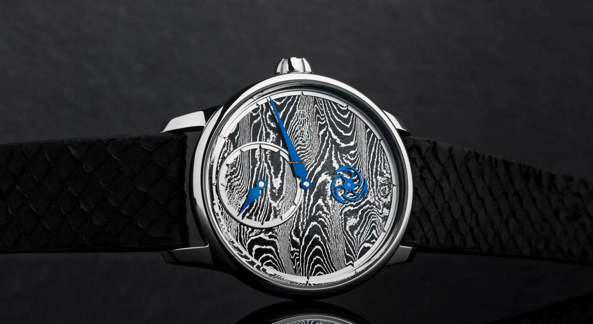 Kapitel- und Stundenzählerringe rhodiniert mit kreisförmiger Satinierung und diamantgeschliffenen Winkeln. Untere Platine aus Damaszenerstahl von Conny Persson (Schmied) und Patrik Sjögren (GoS), Louis Erard- und GoS-Symbole bei 3 Uhr in Weiß übertragen. Das Zifferblatt wurde von Patrik Sjögren (GoS) entsprechend seiner künstlerischen Identität entworfen.