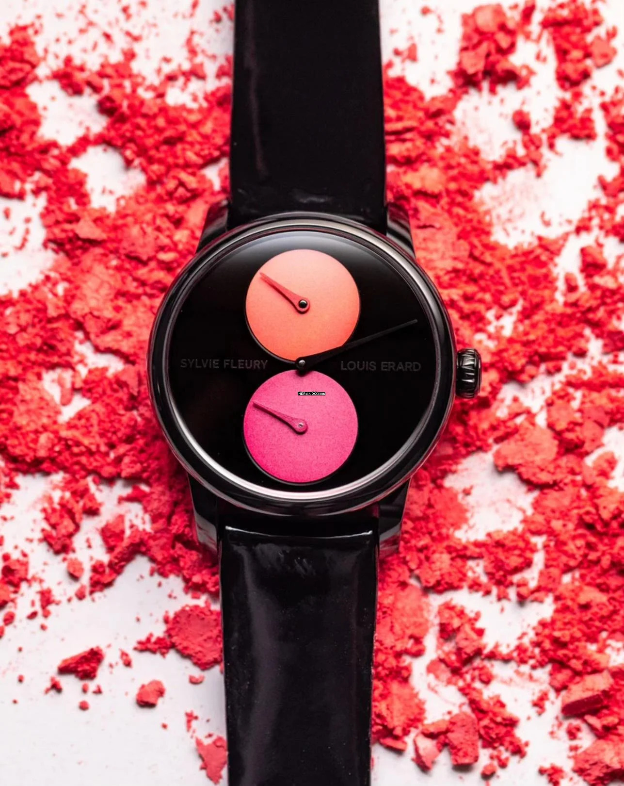 Inspiriert von Sylvie Fleurys Arbeiten in Form von Schminkpaletten: schwarzes, poliertes Lackzifferblatt mit schwarzen Transfers, mattkorallenfarbener, gewölbter Stundenzähler und mattmagentafarbener, gewölbter Sekundenzähler, Louis Erard- und Sylvie Fleury-Logo bei 3 Uhr bzw. 9 Uhr