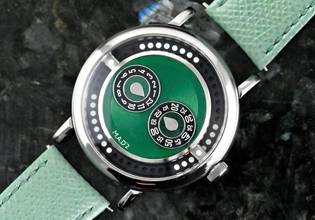 Rare and exceptional MB&F M.A.D.2 / MAD2 “green” | in steel | MB&F La Joux-Perret automatic caliber G101 | creation by Eric Giroud and represents the 20-year design partnership between him and Maximilian Büsser, the founder of MB&F | green dial with green minute and hour sub-dials | original MB&F leather strap and the original MB&F double folding clasp in steel | unworn condition | full set including the following accessories: original MB&F box with cardboard slipcase – original digital QR code – original MB&F lapel pin.