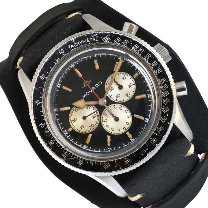 Movado Chronograph Super Sub Sea Stahl, Baujahr ca. 1960, gerändelte Stahllünette mit tachometrischem Skaleneinsatz schwarzer Farbe original Movado der Epoche, gewölbtes Kunststoffglas, mattschwarzes Zifferblatt zu drei Zählern mit Indexen und Zeigern zu Tritium, mechanisches Uhrwerk mit Handaufzug, schwarzes Kalbslederarmband mit original Movado Stahlschließe der Epoche.