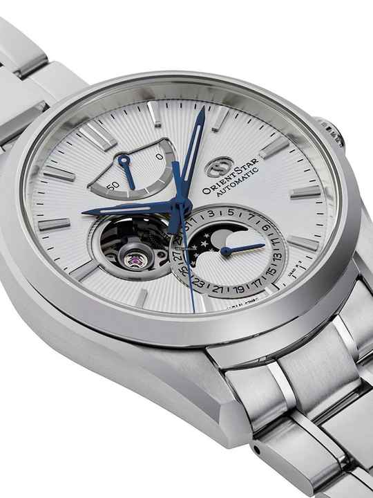 Das Herzstück dieses Zeitmessers ist ein Automatik Uhrwerk , das, wie für Orient Star Uhren üblich, eine präzise Zeitmessung garantiert und folgende Funktionen bereitstellt: Datum, Gangreserveanzeige, Minute, Mondphase, Sekunde, Stunde.
