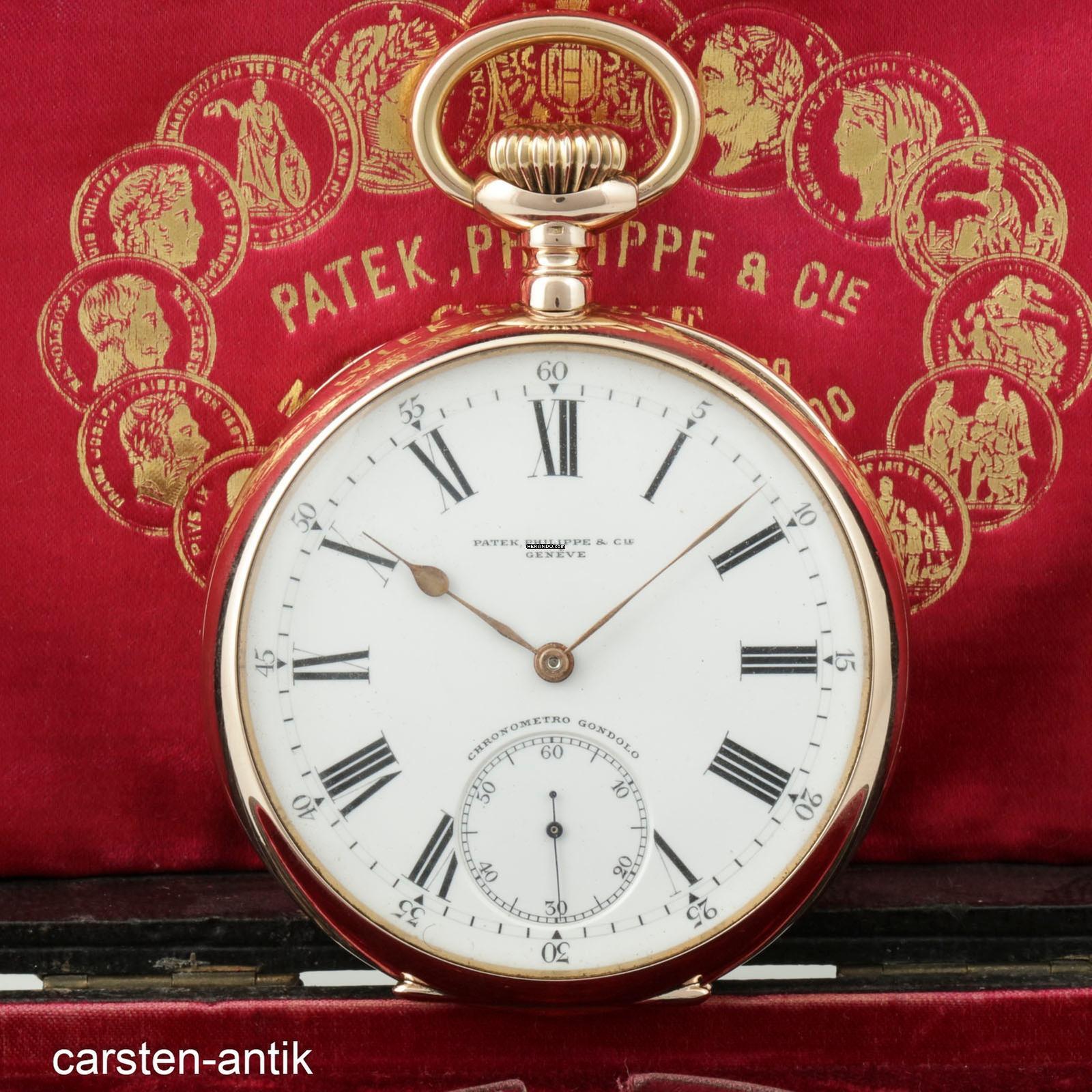 Originales, vierteiliges "bassine“ 18k Gelbgold Gehäuse, Rückdeckel guillochiert, diese ist wunderbar kräftig, nahezu ohne Abnutzung: Die Signatur der Gold Cuvette ist ebenfalls besonders fein gearbeitet (in „taille-douce“): "CHRONOMETRO GONDOLO / Fabricado expressamente para Gondolo & Labouriau Relojoeiros / RIO-DE-JANEIRO". 18K, mit der Patek Philippe Gehäuse-Punze und der Schweizer Kontrollpunze für 18K in beiden Deckeln, die Cuvette Innenseite ist gebürstet. Hergestellt wurde die Uhr für den brasilianischen Markt. Das Gehäuse ist in einem sehr schönen, beinahe ungetragenem, Zustand mit nur minimalen Gebrauchsspuren.
