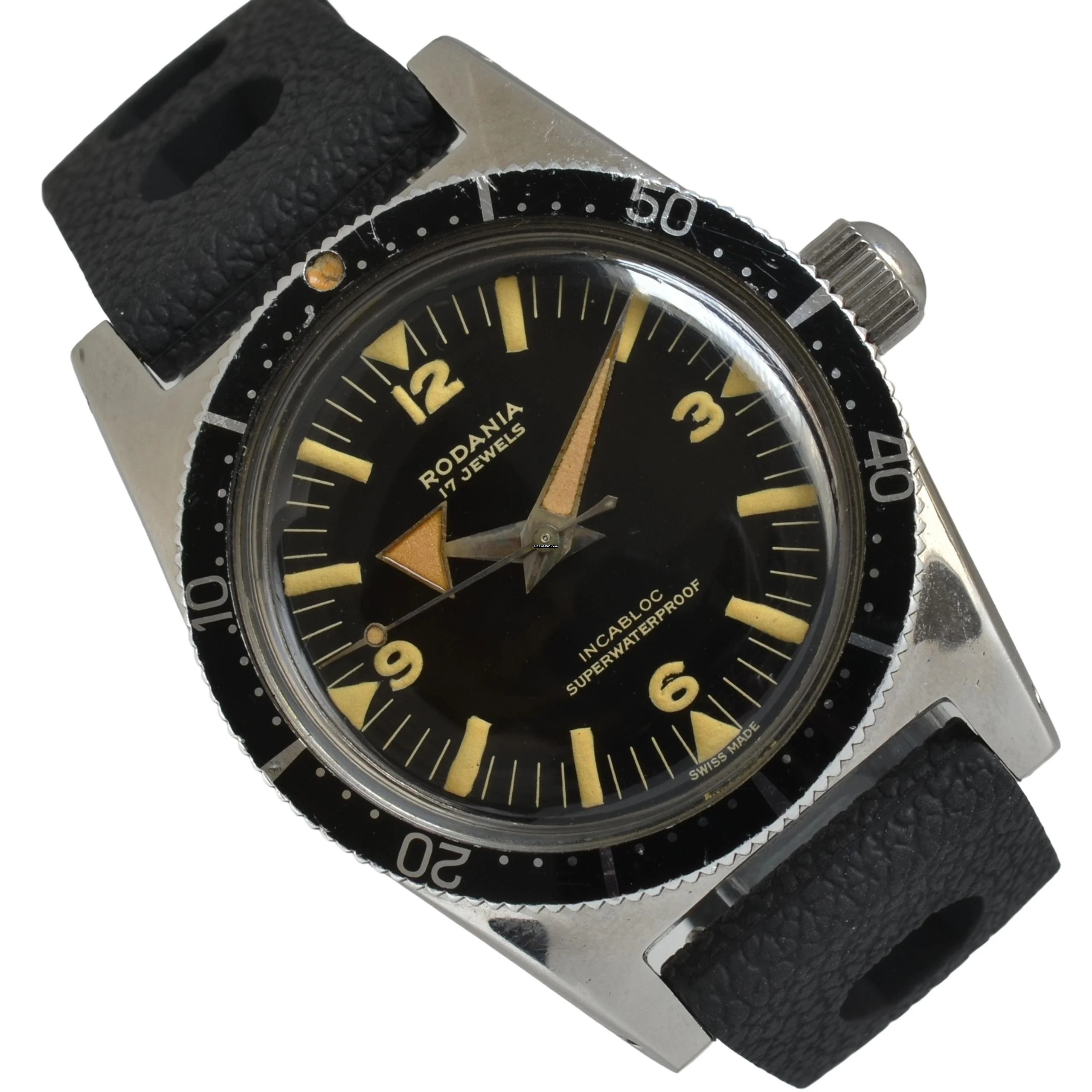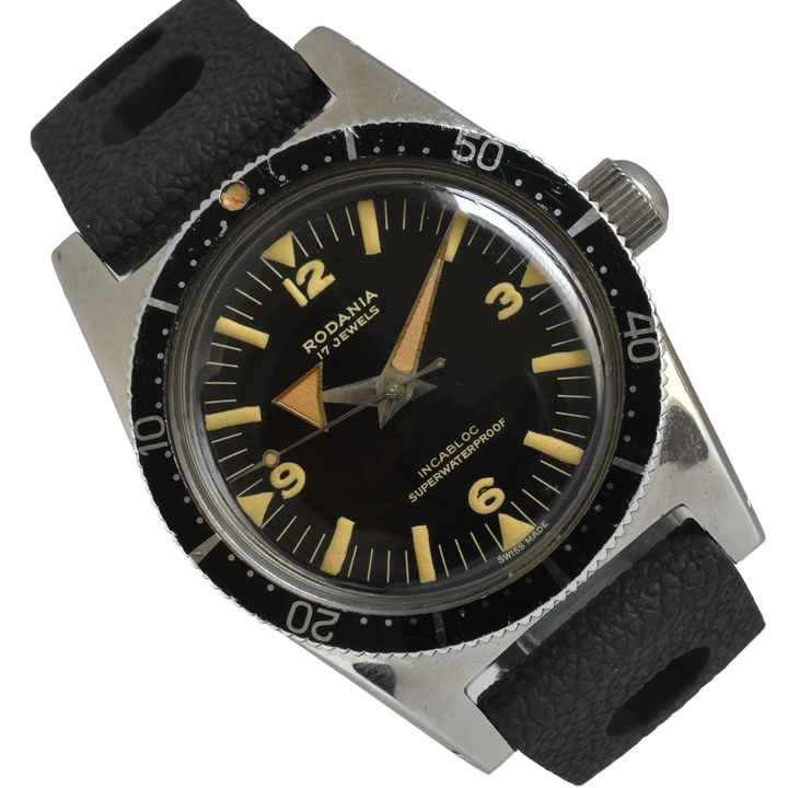 Rodania Diver Superwaterproof 1212H Incabloc Stahl, Baujahr ca. 1960, bidirektionale Aluminiumlünette in Schwarz mit Skala, gewölbtes Kunststoffglas, schwarzes Zifferblatt mit arabischen Indizes und Tritiumzeigern, mechanisches Uhrwerk mit Handaufzug, schwarzes Tropic-Kautschukarmband mit generischer Stahlschließe.