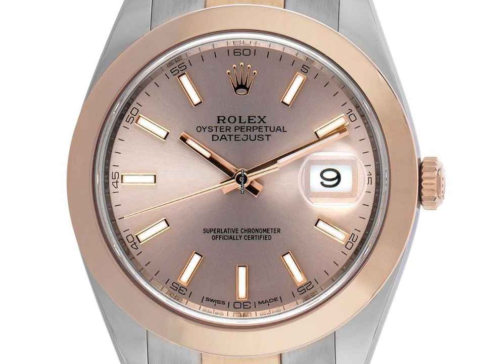 Rolex Datejust Stahl Roségold Everose Automatik Armband Oyster Gehäuse Edelstahl poliert und satiniert, Gehäusedurchmesser ohne Krone 41mm, Gehäusehöhe 11,5mm, Lünette 18kt Roségold Everose glatt und poliert. Armband Oyster Edelstahl / 18kt Roségold Everose poliert und satiniert, Faltschließe Edelstahl / 18kt Roségold Everose mit Hersteller Logo. Zifferblatt Sundust mit aufgesetzten roségoldenen Indexen und roségoldenen Zeigern. Uhrwerk Automatik, Chronometer mit Zeugnis, Rolex Manufakturkaliber 3235 mit 31 Edelsteinen. Anzeige von Stunde, Minute und Sekunde über Zeiger aus der Mitte mit Sekundenstopp zur sekundengenauen Einstellung der Uhrzeit, Datumsanzeige mit Schnellverstellung unter Glaslupe bei 3 Uhr. Saphirglas kratzfest. Krone verschraubbar mit Hersteller-Logo. Boden Edelstahl verschraubt. Gewicht der Uhr inklusive Armband 148g, Länge des Armbandes inklusive Gehäuse 175mm. Referenznummer: 126301, ID: P2853222220426HW-15900/16350, Artikelnummer: 10000085551. Mit Gangkontrolle und kompletter äußerlicher Aufarbeitung von April 2026. Original Rolex Box mit Umkarton und Garantie Papiere von März 2022, LC 170 / Italy EU sowie Beschreibung, Ledermäppchen, Rolex Chronometer-Siegel und Watchregister Auszug von April 2026, The Watch Register Zertifikat / ohne Eintrag (Internationale Datenbank für verlorene oder gestohlene Uhren), Full Set. Superschnäppchen, Kapitalanlage mit Wertsteigerungspotential, sehr seltenes Sammlerstück. Wie Neu. Lieferzeit sofort. Inklusive certified pre owned Zertifikat / Uhrenpass mit einem Farbbild, der genauen Beschreibung sowie dem Wiederbeschaffungswert der Uhr über 15900,-€ und 1000 Tage Garantie ab Kaufdatum.