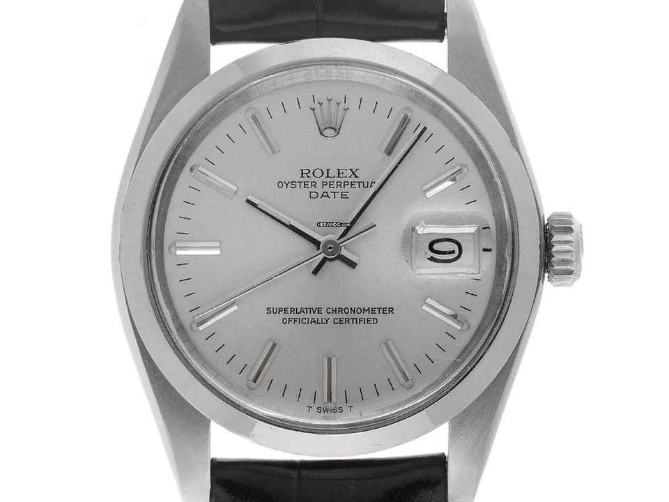 Rolex Oyster Perpetual Date Stahl Automatik Armband Leder Gehäuse Edelstahl poliert und satiniert, Gehäusedurchmesser ohne Krone 34mm, Gehäusehöhe 11,8mm. Lünette Edelstahl glatt und poliert. Rolex Armband Leder schwarz mit Ziernaht, Anstoßbreite 19mm, Stiftschließe Edelstahl mit Hersteller-Logo. Zifferblatt silberfarben mit "T SWISS T" Aufdruck, aufgesetzten weißgoldenen Indexen und weißgoldenen Zeigern. Uhrwerk Automatik, Chronometer, Rolex Manufakturkaliber 1570 mit 26 Edelsteinen. Anzeige von Stunde, Minute und Sekunde über Zeiger aus der Mitte mit Sekundenstopp zur sekundengenauen Einstellung der Uhrzeit, Datumsanzeige unter Glaslupe bei 3 Uhr, open 6/9 (offene 6 und 9 in der Datumsanzeige). Plexiglas. Krone verschraubbar mit Hersteller-Logo. Boden Edelstahl verschraubt. Gewicht der Uhr inklusive Armband 52g. Referenznummer: 1500, Gehäusenummer: 6236XXX, Baujahr: 1980, ID: P286947060426HW-6900, Artikelnummer: 10000085578. Mit Gangkontrolle und kompletter äußerlicher Aufarbeitung von April 2026. Original Rolex Box und Ledermäppchen, Übersetzungsheft, Rolex Chronometer-Siegel sowie Watchregister Auszug von April 2026, The Watch Register Zertifikat / ohne Eintrag (Internationale Datenbank für verlorene oder gestohlene Uhren). Superschnäppchen, Kapitalanlage mit Wertsteigerungspotential, extrem seltenes Sammlerstück. Sehr guter Zustand. Lieferzeit sofort. Inklusive certified pre owned Siegel / Uhrenpass mit einem Farbbild, der genauen Beschreibung sowie dem Wiederbeschaffungswert der Uhr über 6900,-€ und 1000 Tage Garantie ab Kaufdatum.