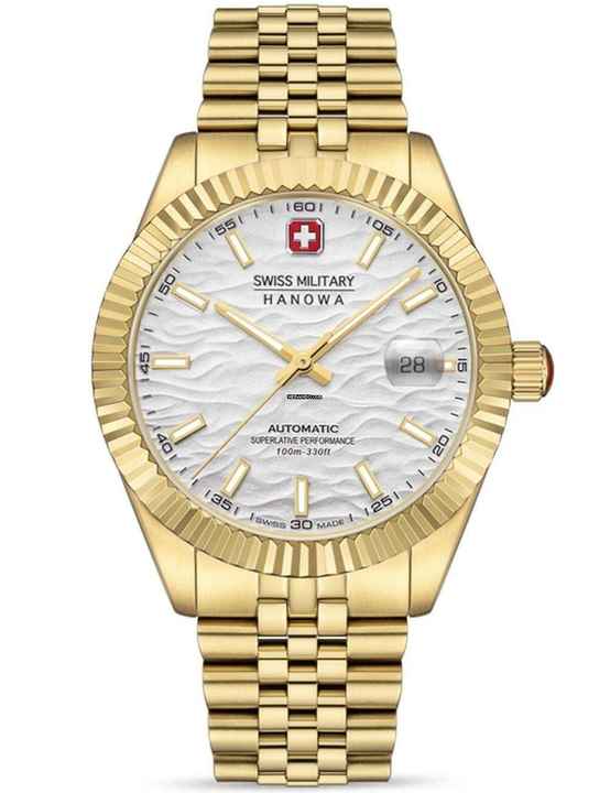 Zusätzliche Freude an Ihrer neuen Swiss Military Hanowa Uhr wird Ihnen das hochwertig verarbeitete Armband aus Edelstahl – Farbe: Gold – mit Faltschließe bereiten. Das Edelstahl-Armband bietet einen hohen Tragekomfort und kann bis zu einem maximalen Handgelenkumfang von 210 mm getragen werden.