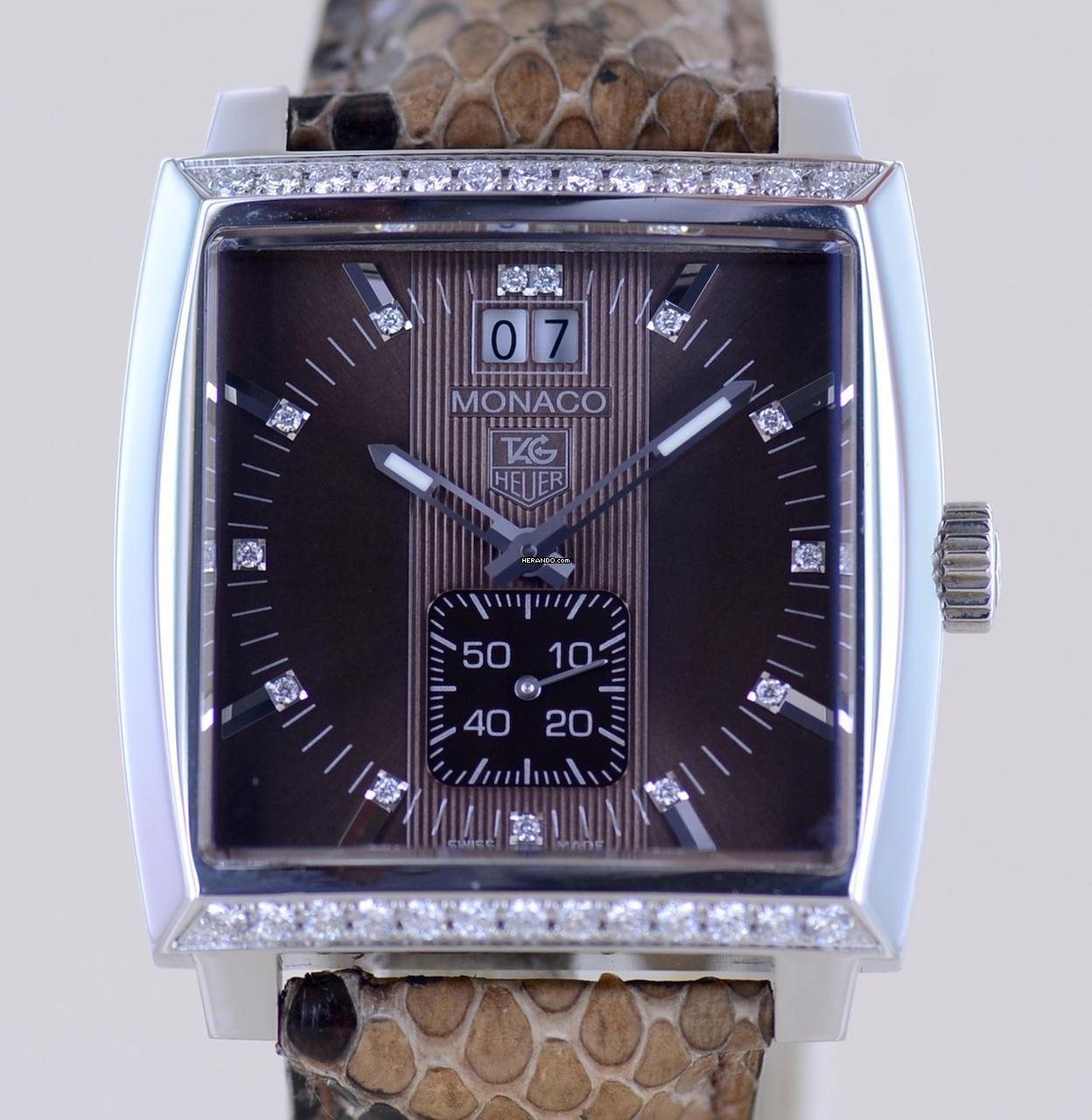 Die Monaco ist bekannt für ihre eckige Gehäuseform und war der erste quadratische Automatikchronograph der Welt. Kurz nach deren Präsentation trug der Filmstar Steve McQueen dieses Modell im Rennfilm Le Mans und sicherte diesem Modell so einen sicheren Platz in den Sammlerherzen, die Benzin im Blut haben. Die elegante Small-Second-Variante erschien später, griff den Stil aber perfekt auf und ist gerade bei Damen sehr beliebt. Es wurden hier zwei Brillantreihen eingearbeitet, die ebenfalls Top Wesselton sind.