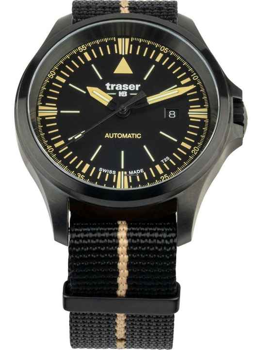 Zusätzliche Freude an Ihrer neuen Traser Uhr wird Ihnen das hochwertig verarbeitete Armband aus Textil – Farbe: Schwarz – mit Dornschließe bereiten. Das Textil-Armband bietet einen hohen Tragekomfort und kann bis zu einem maximalen Handgelenkumfang von 225 mm getragen werden.