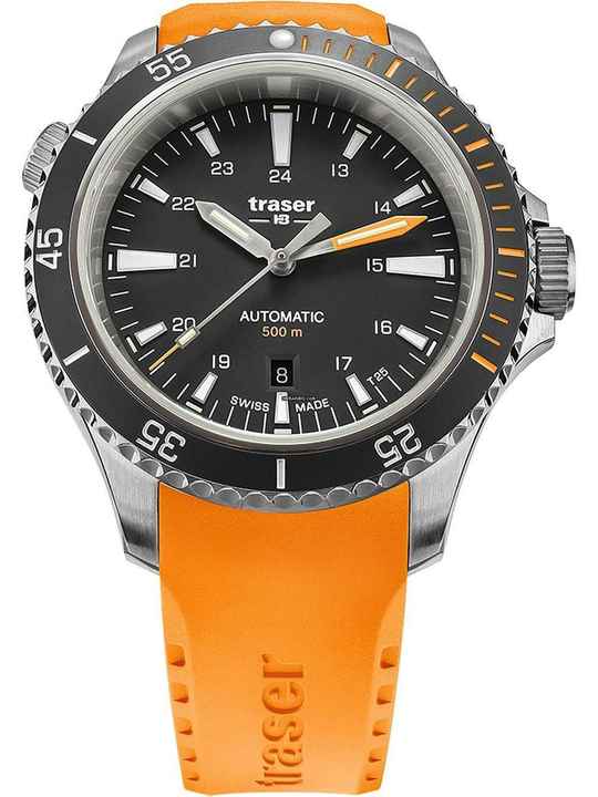 Zusätzliche Freude an Ihrer neuen Traser Uhr wird Ihnen das hochwertig verarbeitete Armband aus Kautschuk – Farbe: Orange – mit Dornschließe bereiten. Das Kautschuk-Armband bietet einen hohen Tragekomfort und kann bis zu einem maximalen Handgelenkumfang von 230 mm getragen werden.