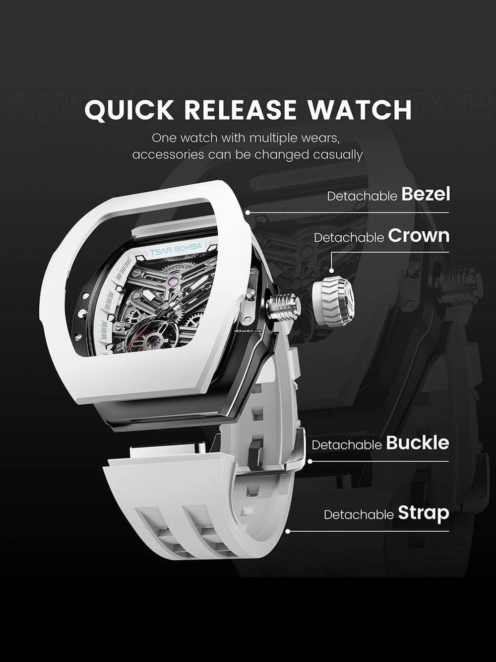 Die Tsar Bomba Herrenuhr TB8218(1+7)FKM-06 ist ein moderner Begleiter aus der Modell-Serie Atomic Interchangeable Watch Combo Automatik 46mm 5ATM. Eine perfekte Wahl, wenn Sie einen Zeitmesser mit einem zeitgemäßen Look suchen.
