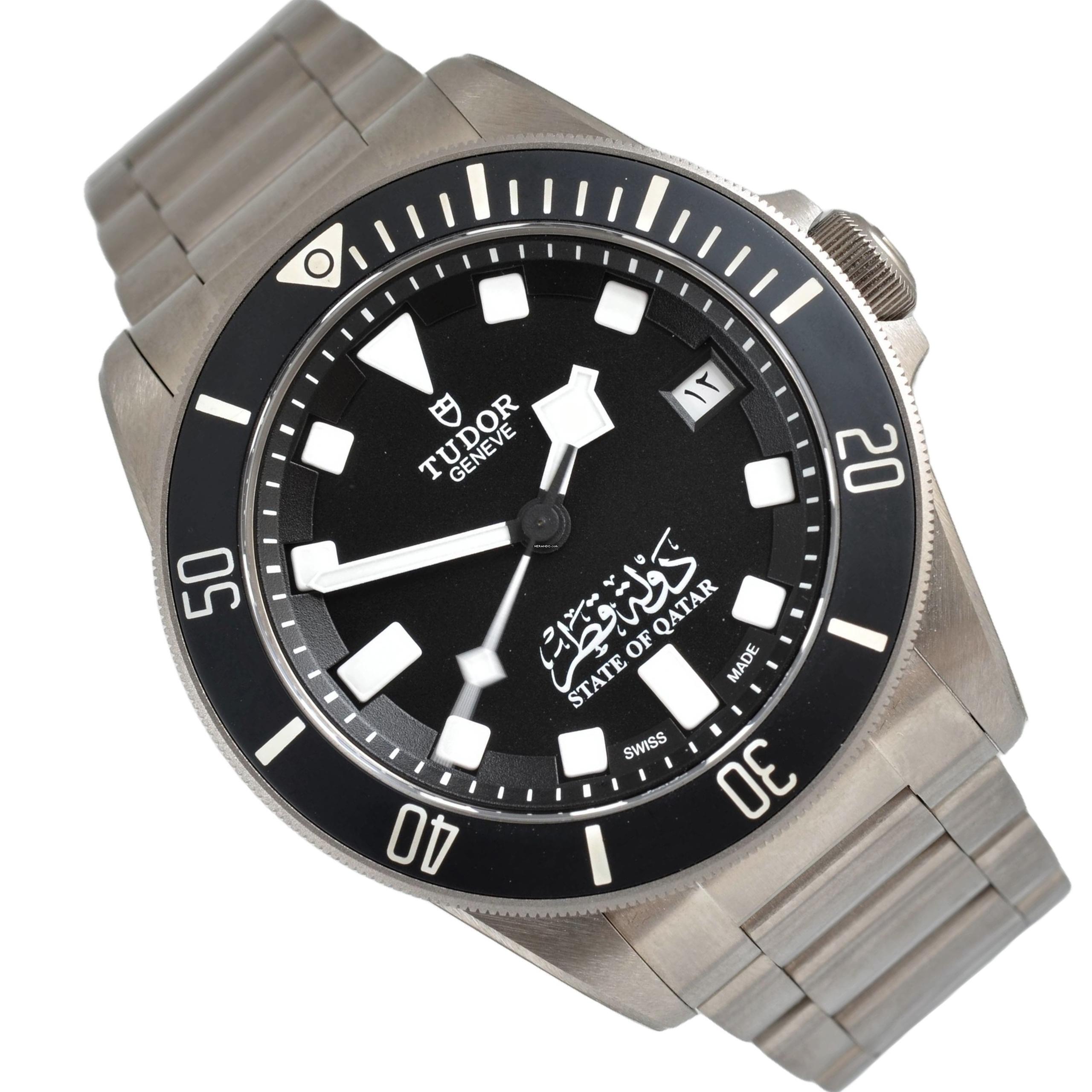 Tudor Pelagos 25600TN Katar 42MM Titan, Baujahr 2020, unidirektionale Titan-Lünette mit schwarzem Keramik-Inlay und 60-Grad-Skala, anti-reflektierendes Saphirglas, schwarzes Zifferblatt mit Inschrift "State of Qatar", Indexe und Zeiger in Chromalight, mechanisches Automatik-Werk, Titan-Oyster-Armband mit original Tudor-Faltschließe, plus ein weiteres schwarzes Gummiarmband mit originaler Tudor-Titan-Schnalle.