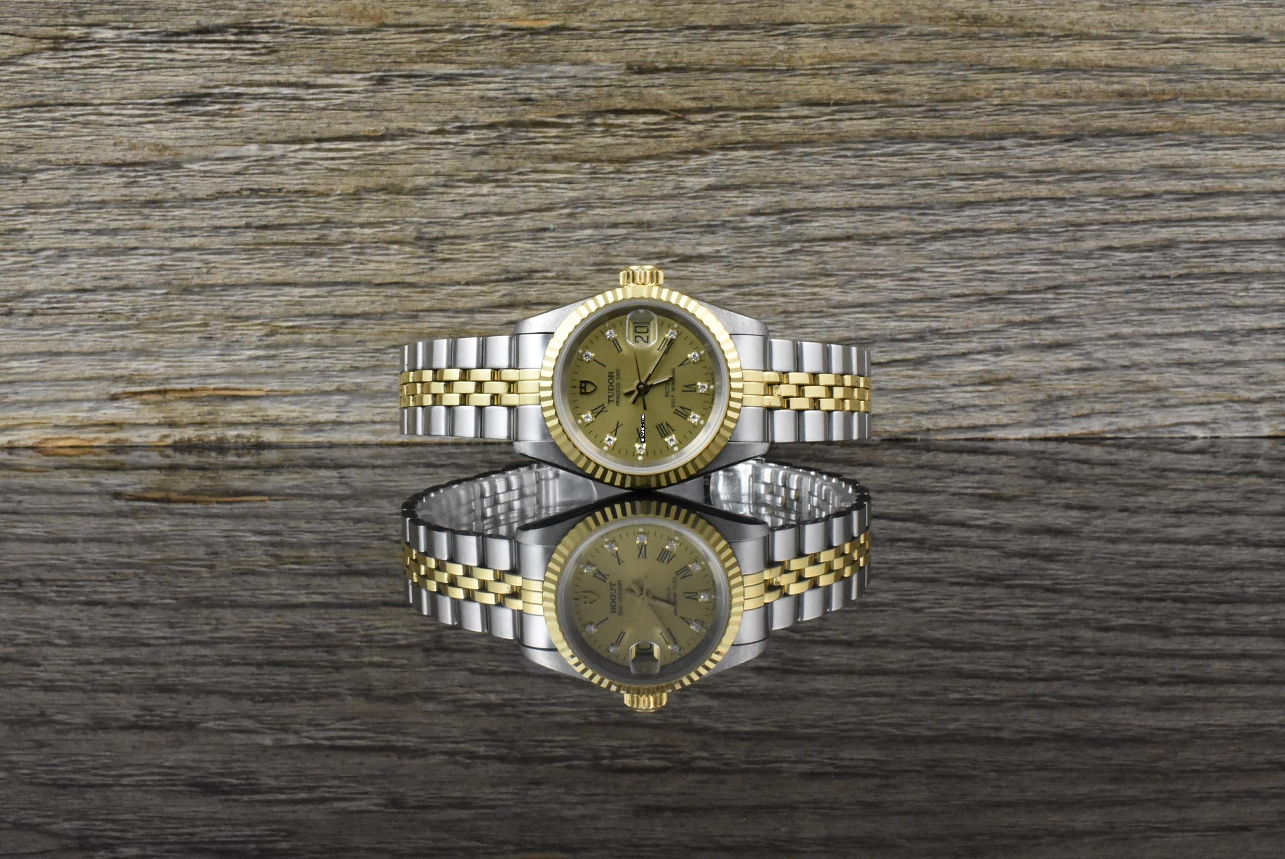 An alle Freunde des guten Geschmacks, angeboten wird eine sehr schöne unpolierte Vintage Tudor Princess Date by Rolex 92413 in Stahl / Gold gefertigt mit einem sehr schönen goldenen Diamant Ziffernblatt aus dem Jahr 1996 mit Papieren – Tudor Service 2024!