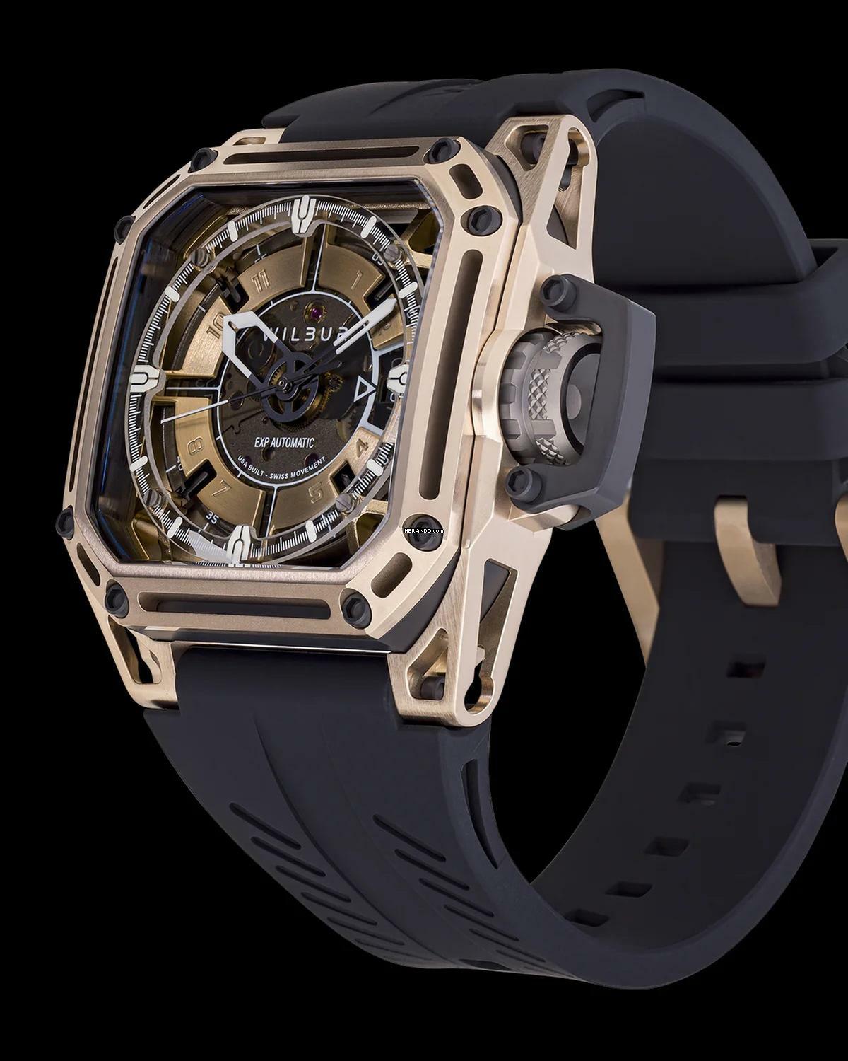 - Exoskelett aus Ti-Gold-Stahl & schwarzer Keramik-Gehäusekern mit weißen und Ti-Gold-Zifferblattdetails und Space Frame. Diese wunderschöne und technisch anmutende Goldbeschichtung wurde speziell von Wilbur entwickelt, um einem hellen Gold-/Bronzeton zu entsprechen, in den wir uns bei einem Porsche GT2 verliebt haben.