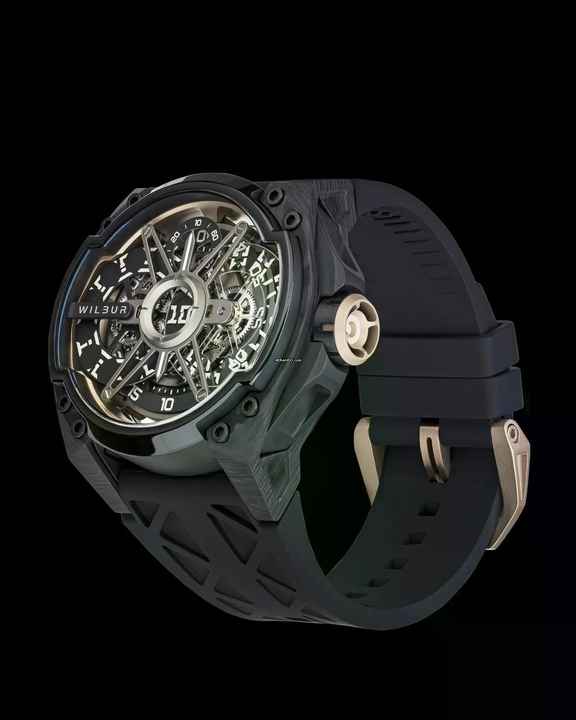 The JW1.5 CF configuration combines machined billet carbon fiber with multi-finish DLC black titanium. Titanium-nitride champagne gold details are retained selectively as technical accents, maintaining continuity with the broader JW1 material system.