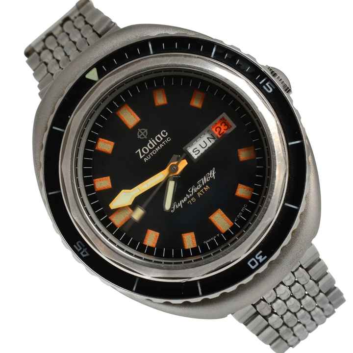 Zodiac Super Seawolf 862-836 Diver Stahl, Baujahr 1969, bidirektionale Stahllünette mit schwarzem Aluminiumeinsatz an Skala, Mineralglas der Epoche, schwarzes Farbzifferblatt mit doppeltem Zähler, Indexe und Zeiger an Tritium, mechanisches Uhrwerk mit Handaufzug, Stahl-Jubiläumsarmband mit ausziehbaren elastischen Maschen Verschluss deployante original Zodiac der Epoche.