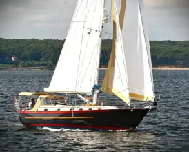 Interior - Varnished teak woodwork. White Formica cabin house trunk sides. - Louvered locker doors & solid drop doors with hidden hinges. - Louvered cabin doors (top half only) & panel head door with piano hinges. - Chrome bronze push button locks on all locker doors and drawers. - 6' 5" headroom with teak & holly sole throughout cabin area. - Positive push button latches on all locker doors. - Wrapped 4" foam cushions with choice of fabrics. - Zippered vinyl headliner with superior insulation, deadens sound & provides easy access to deck hardware & wiring. Forecabin - 6' 7" long and 57" wide double island berth with drawers & shelves. - Teak ceilings above shelves. Teak bi-fold privacy door. - Vanity sink, mirror & large cedar-lined, louvered hanging locker. Main Salon - 6' 6" long "U" shaped dinette to starboard converts to 50" wide dbl. berth. - Sides have teak lockers & bookshelves with removable fiddles above seats, storage bins below. - Teak drop leaf table with with gas spring pedestal. - 6' 3" long settee berth to port with storage below. - Teak navigators desk w- storage under lift top. Nav panel & book shelves. - Enclosed head with bi-fold solid panel door, nonskid flooring, ceramic head with macerator to holding tank, teak changing seat, wet locker, separate shower stall, and numerous dry storage lockers.